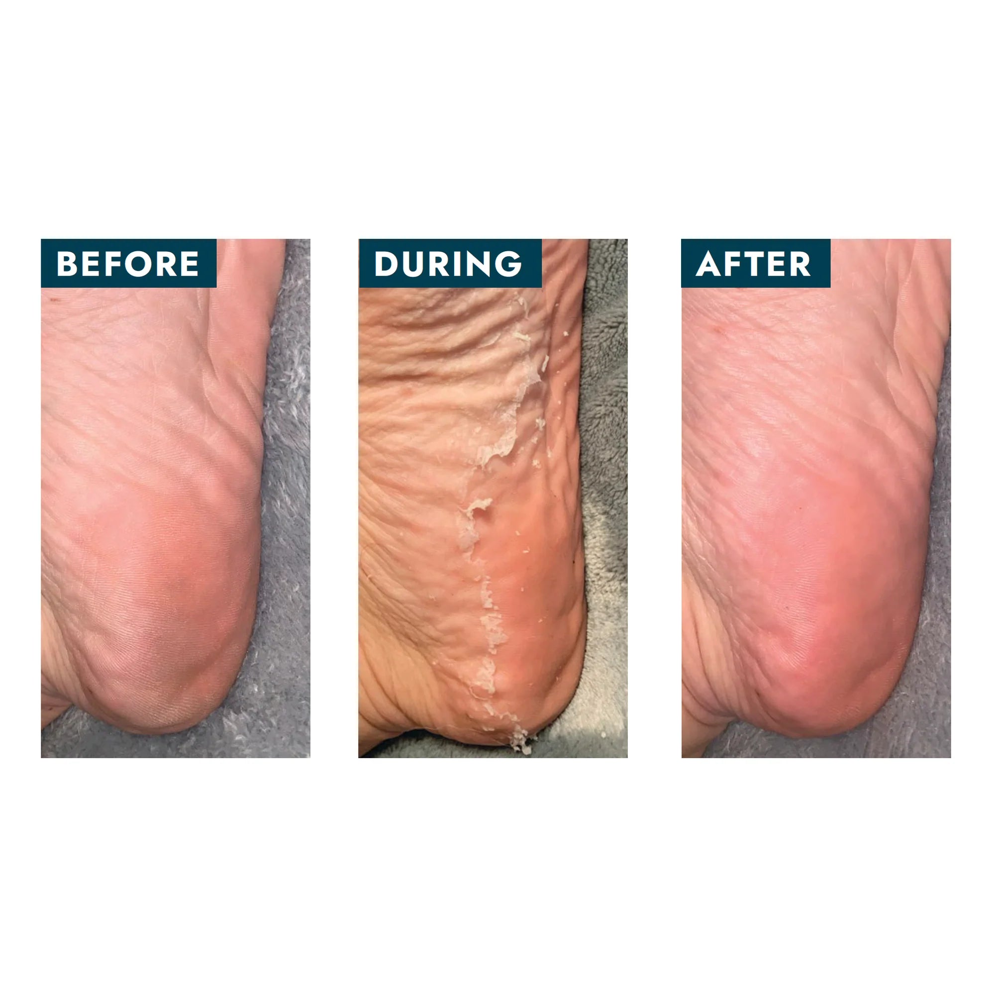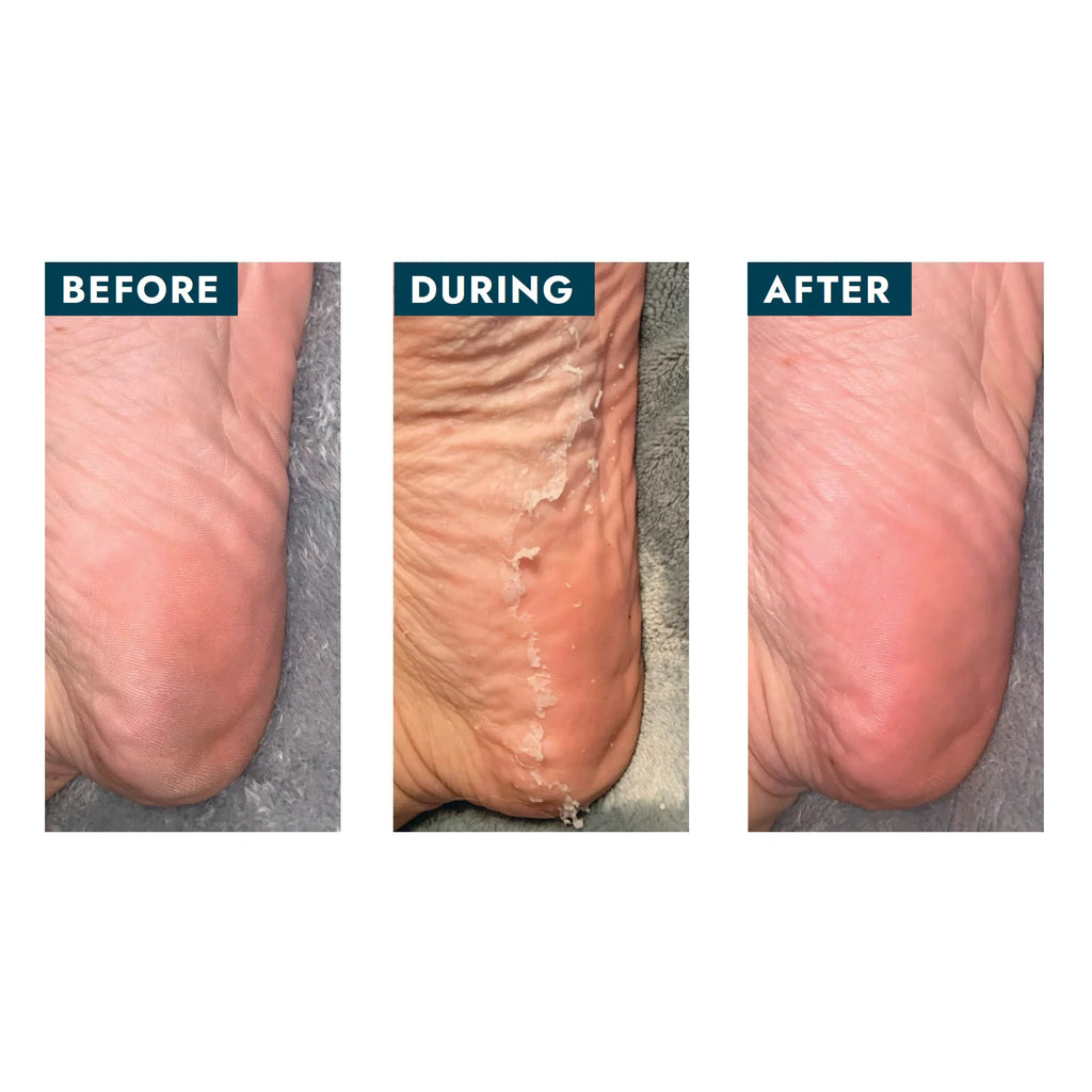 Step 5: Remove socks and wash feet thoroughly. Dead skin will naturally begin to peel off in 7-10 days. For extremely callused heels, use a foot file to help remove dead skin.