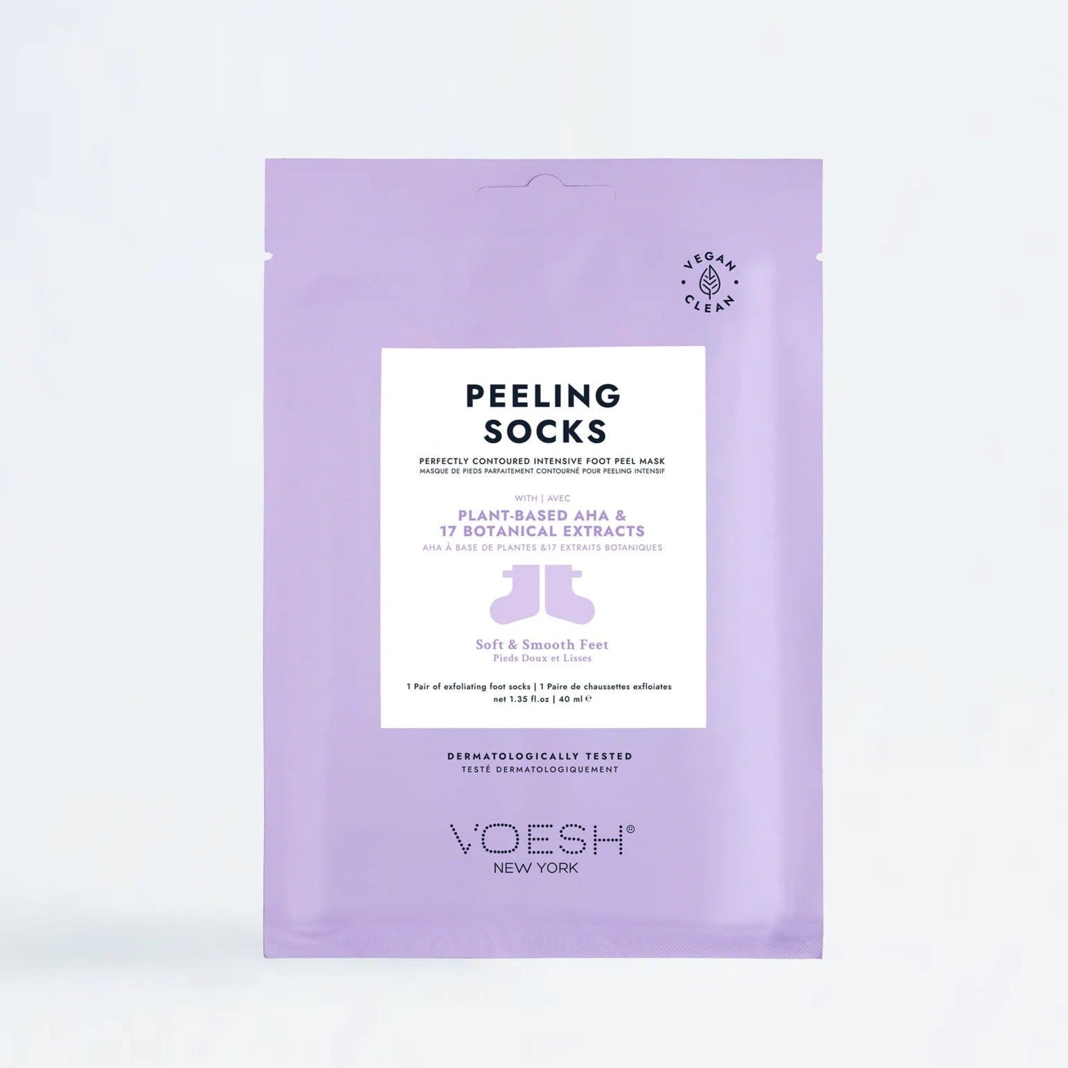 Voesh Peeling Socks are formulated with sugarcane-derived acids (AHA/BHA), lavender, and herb extracts to naturally peel off skin and soothe your feet at the same time. These vegan, natural ingredients work to penetrate dead skin cells and calluses for gentle, yet effective, exfoliation. Dead skin will typically peel off on its own within 7-10 days, so be sure not to pick or peel your skin.