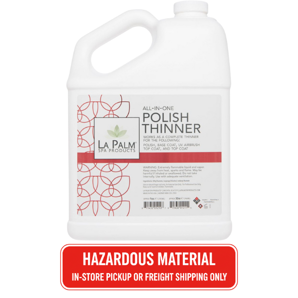 LaPalm's Polish Thinner is formulated to be compatible with any nail polish, base coat, polish topcoat, UV topcoat, and airbrush topcoat. Get the most out of your polishes!
